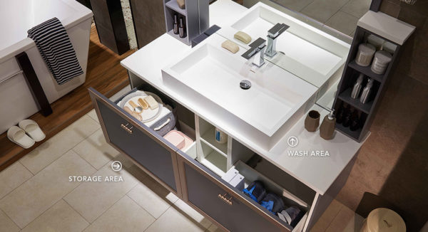 Wall-mounted medicine cabinet with gray tone wood grain melamine finsh gives this bathroom a cheerful look without compromising the clean lines.